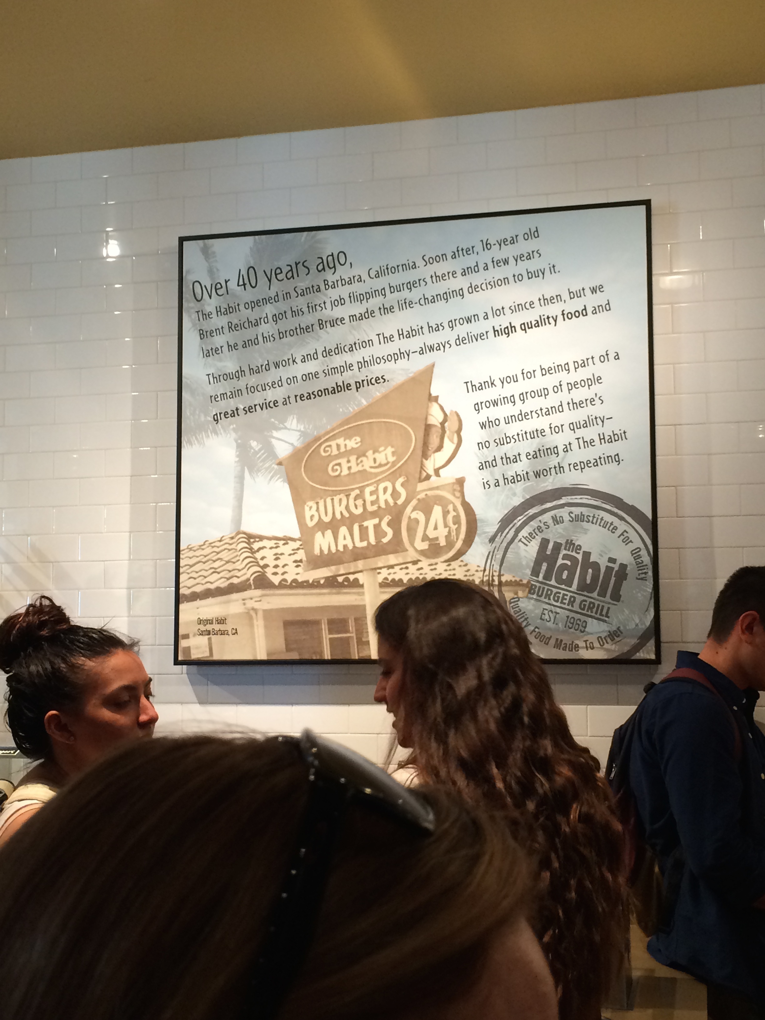The first week of lecture Professor Blum was constantly talking about how history is all around us, or better yet, how we are “haunted by history.” I was at The Habit for lunch and saw this sign that literally described the history of the restaurant I was in. This is a perfect example of how we are living in parts of history every day without even knowing it. This restaurant didn’t just appear out of thin air, but was carefully planned in the past and has evolved into what it is today. Although it is different from the first Habit, it has the same premise that was put into place over 40 years ago.