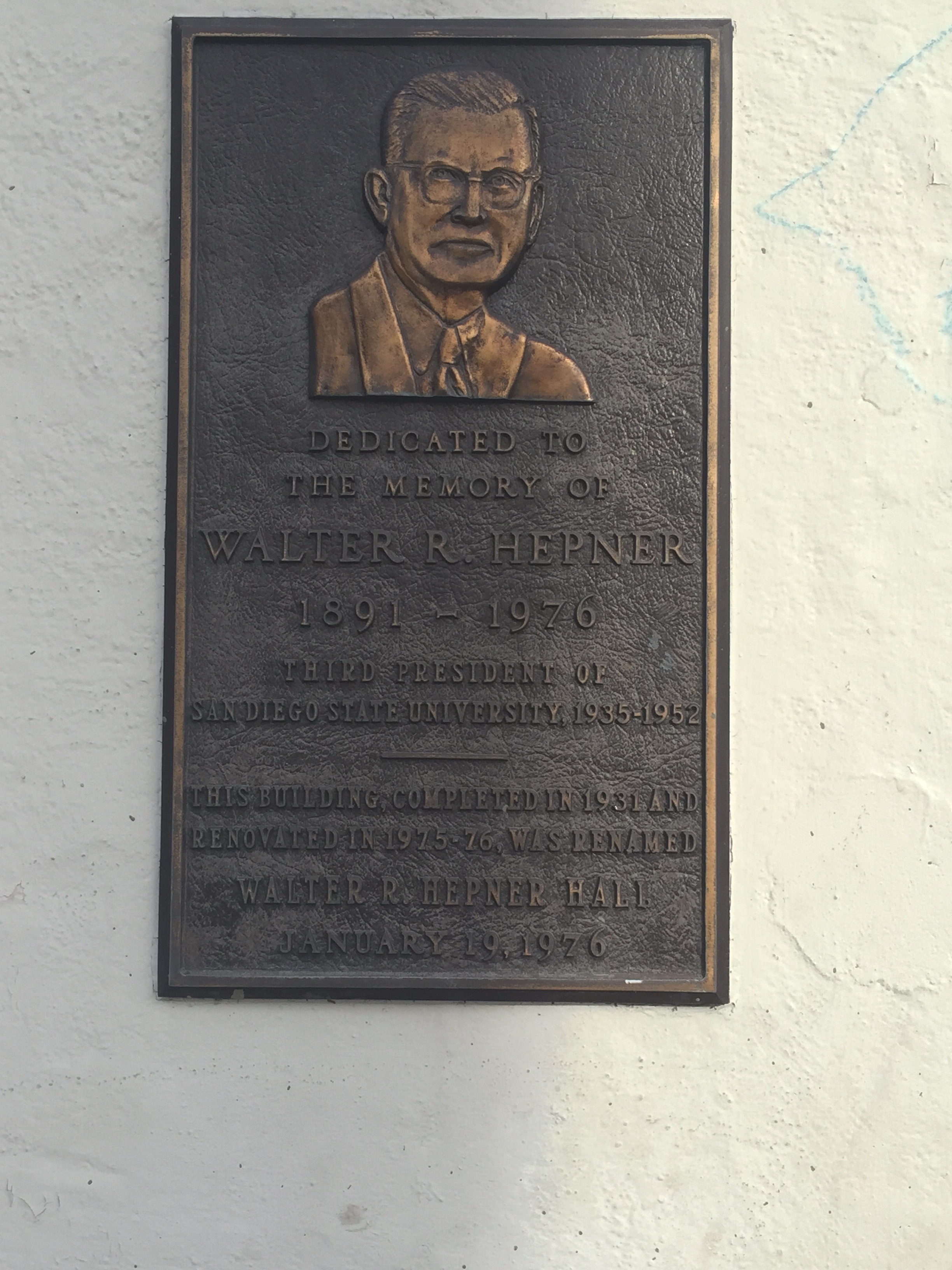 I saw this on the wall of Heper Hall building. This is a picture of our third president Walter R. Hepner . There are information about him such as his date of birth and the day he passed away, his presidential terms here at SDSU. Walking around campus, we can see many historical objects; such experience makes me remember about what Professor Blum said during lecture “We’re haunted by History” .If we pay more attention, we may spot many different things that remind us of many historical events. In order for us students to remember the great work of our former president, SDSU made a statue of Walter R. Hepner and put it on campus.