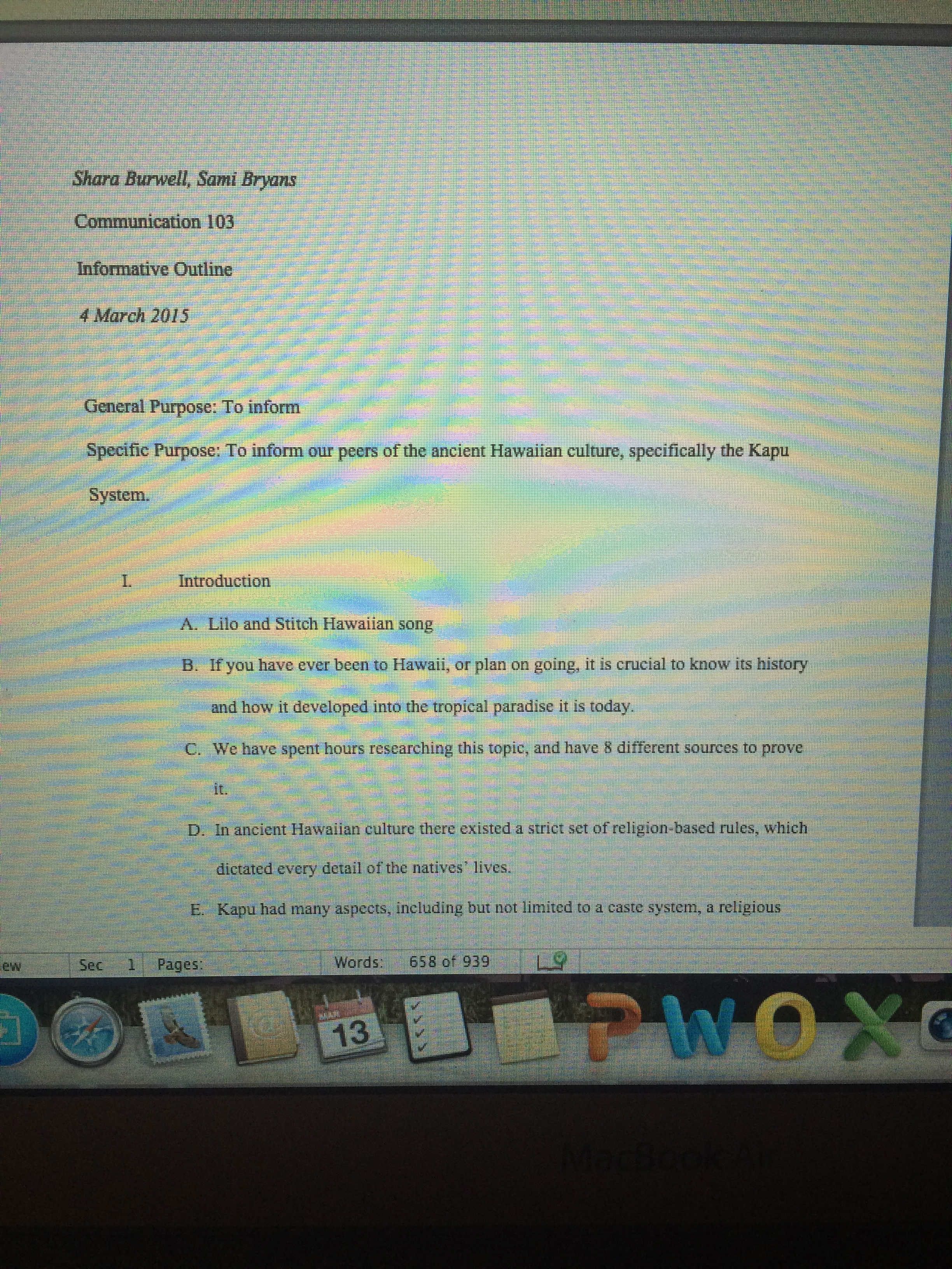 My roommate and I are doing a partner speech in Comm103, a required freshman class. Our assignment is to research the traditions of a past culture and we delved into the history of the Ancient Hawaiians, which we found really interesting and ended up reading more than necessary.