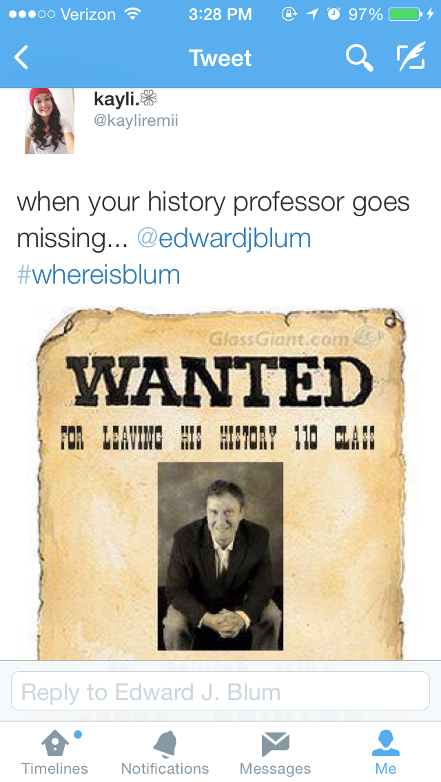 Extra Credit Hack- Where is Blum? March 25, 2015kaylirapozo I have shared this Wanted ad with friends via word of mouth and through twitter in order to #FindBlum. Share this: Click to share on X (Opens in new window) X Click to email a link to a friend (Opens in new window) Email Click to share on Facebook (Opens in new window) Facebook Click to share on LinkedIn (Opens in new window) LinkedIn Click to share on Pinterest (Opens in new window) Pinterest Click to share on Tumblr (Opens in new window) Tumblr Like Loading... Related