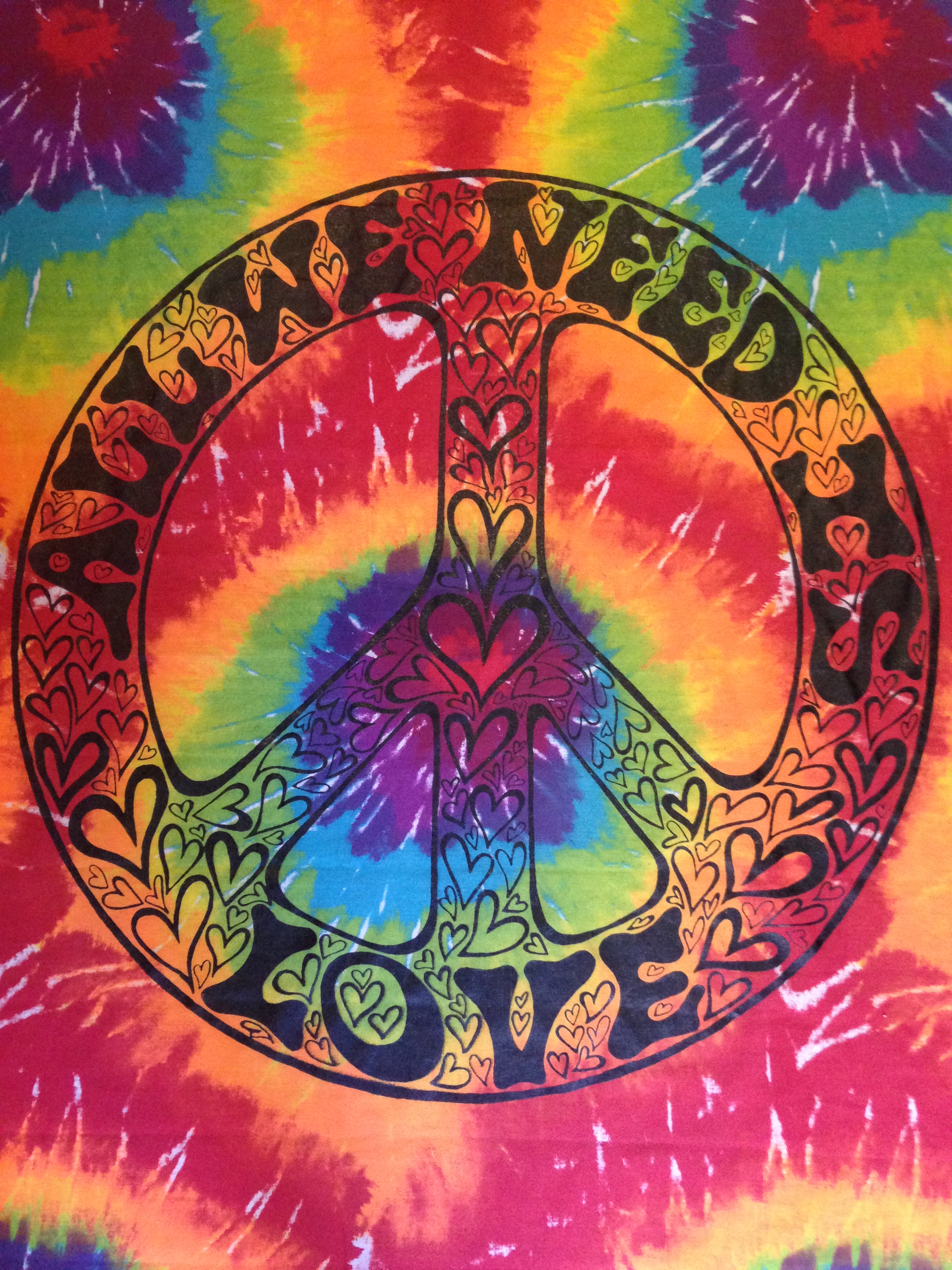 In lecture today, Professor Putman was talking about counterculture and hippies. He described how they rejected the mainstream and cultural norms for a different type of lifestyle. This included tie dye, drugs, and the concept of love over war. My friend that lives next door to me in the dorms has the most colorful room I’ve ever come across. The only way it can be described is colorful and happy. I realized that she has this small tapestry (pictured below) draped across her bed and it completely embodies the hippie counterculture. “Make Love, Not War” and “All we need is love” were two common phrases of the time.