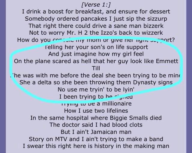 During the presentation about Emit Till I first shocked that I hadn’t learned about the event before, but I also knew that I had heard the name many times before. For spring break my friends and I road tripped up to San Francisco, and on the way I figured out where I had heard it – in a Kanye West song. I was driving and the song “Through the Wire” by Kanye came on spotify while everyone else was asleep and I couldn’t believe it. I had heard the song countless times and always wondered what he had meant by his girlfriend being afraid that he looks like Emit Till after his almost fatal car crash, and now I know.