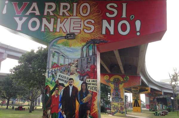 Today in large lecture, Professor Putman talked about the Chicano Movement. Here in San Diego we have our own Chicano Park in Barrio Logan by the Coronado Bridge. For this specific mural, the people living there wanted their neighborhood to be rezoned. The translation of “Varrio Si, Yonkes No!” is “Neighborhoods yes, junkyards no!” The people wanted the junkyards to be moved so they could keep their neighborhoods clean from car parts falling into their backyards.