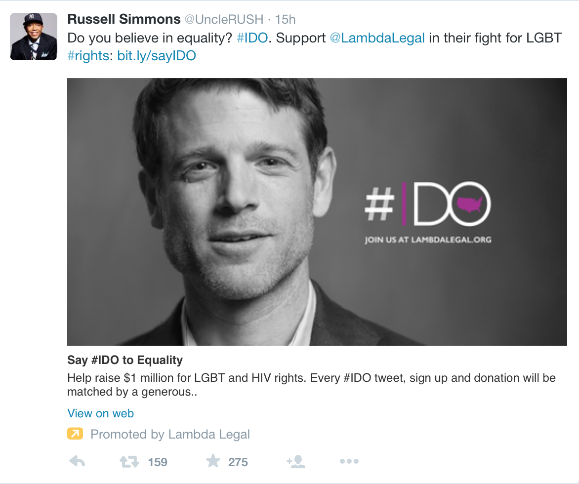 As I was reading the discussion questions for this week’s class, I noticed one mentioned the Gay Liberation Movement. As I was scrolling through my twitter feed today, I had come across this promotion about how Russell Simmons was advocating for gay rights. The gay community, just like any other community just wants to be accepted. It is crazy how that even in todays society and how we are advancing everyday, some people still look at gays as out of the norm and we have to continue addressing a subject that shouldn’t be a concern in the first place. Gays are humans too and don’t deserve to get the third degree.