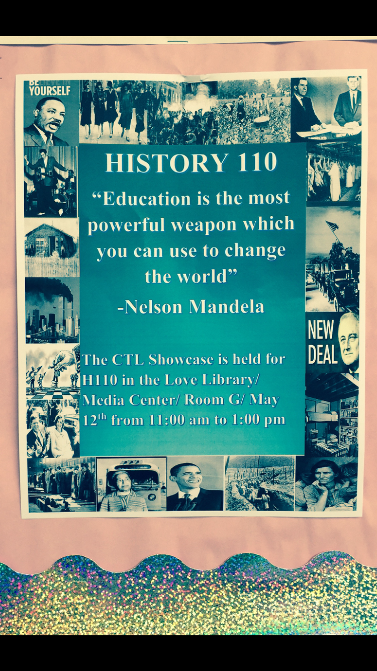 I put this flyer up on the bulletin board in my dorm. I chose a quote by Nelson Mandela because history is part of our education which has changed our world. Around the border I put pictures from every year of the Hist book to show how history has evolved over time.