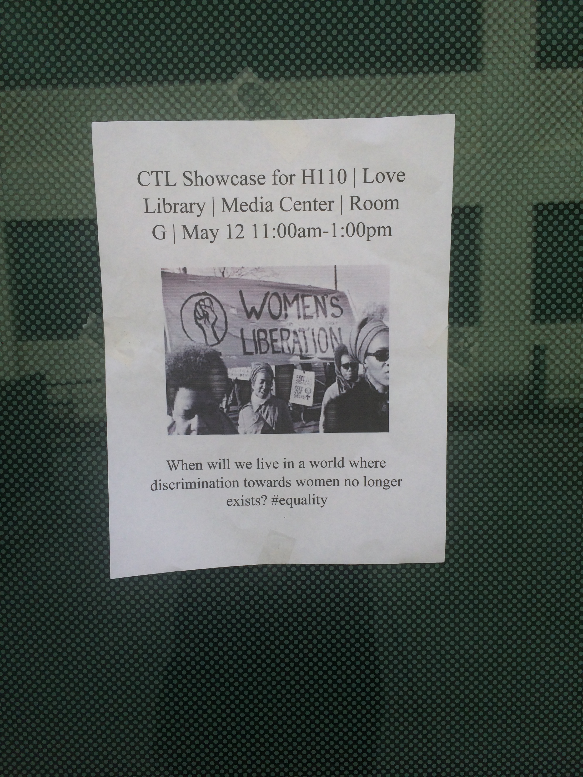 CTL Showcase May 11, 2015kelseyhalse I posted the CTL Showcase flyer on one of the entrances to Storm Hall West. “When will we live in a world where discrimination towards women no longer exists? #equality” Share this: Click to share on X (Opens in new window) X Click to email a link to a friend (Opens in new window) Email Click to share on Facebook (Opens in new window) Facebook Click to share on LinkedIn (Opens in new window) LinkedIn Click to share on Pinterest (Opens in new window) Pinterest Click to share on Tumblr (Opens in new window) Tumblr Like Loading... Related