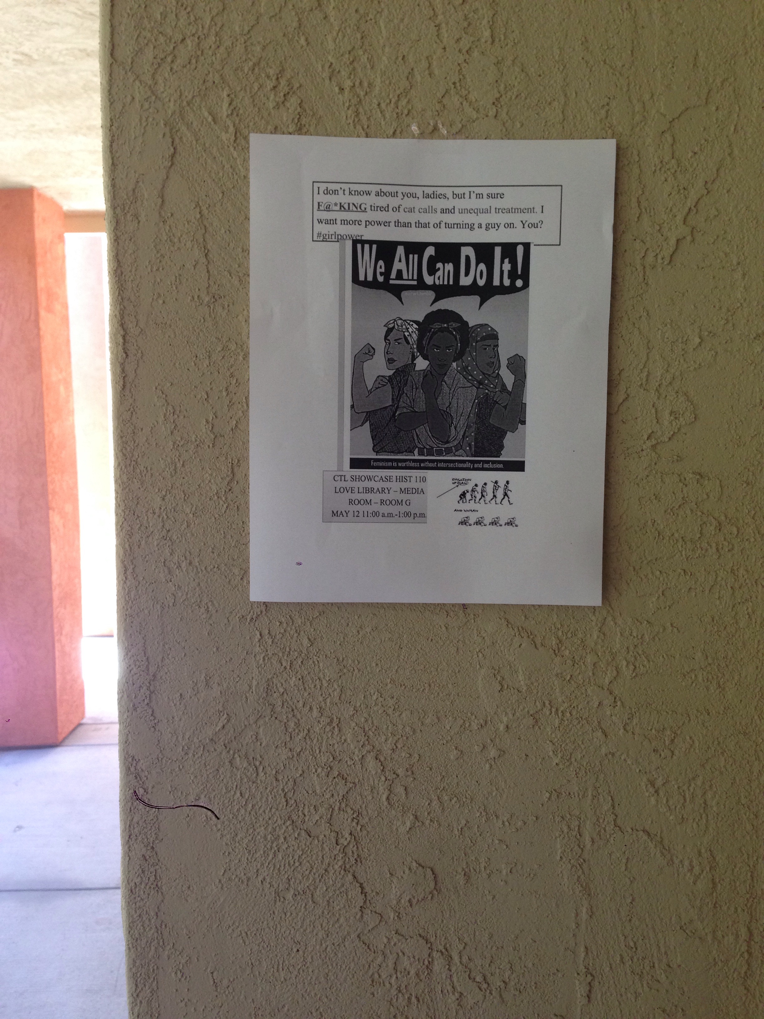 I put this flier near an entry of Aztec Corner Apartments. I figured a lot of students wouldn’t be on campus so I brought the flier to them. It says “I don’t know about you, ladies, but I’m sure F@*King tired of cat calls and unequal treatment. I want more power than that of turning a guy on. You? #girlpower”