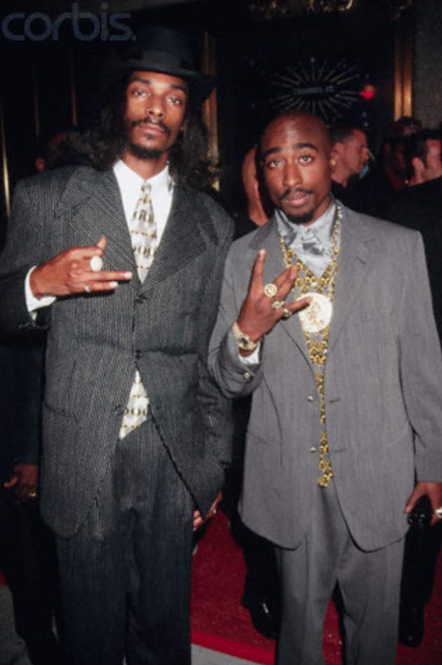 Snoop Dogg, also a very critical leader of rap music, and Tupac were viewed as a powerful team. This is probably one the the most important images of them because it shows that no matter the occasion, they stayed true to their west coast roots. The two are also dressed up in suits. Looking closely, you can see the jewelry they are wearing on their fingers. This, though a minor detail, is important because they were known for being extremely wealthy. They used their wealth to promote their west coast lifestyle and attract the support and attention of the public. They were an embodiment of the American Dream because they showed that they could reach the top of society despite the racial tensions of the 1980s and 1990s. They were also trailblazers in changing the fabric of society. They made it okay to be from a less wealthy background and proved that with enough focus and dedication, one could work their way to the top. All eyes were on them because of the impact they had on rap music. They were leaders in the genre and without them, the face of rap would be incredibly different.