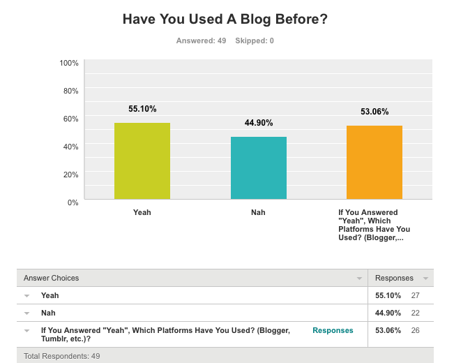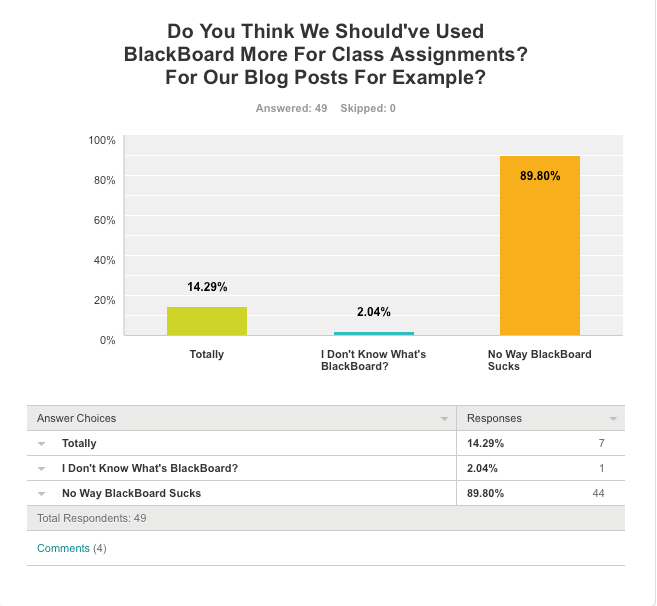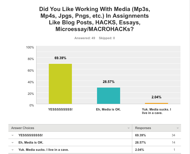 Some Data… Survey Participants were Voluntary. There were 49 Respondents from two sections of H110. Question 1 Question 2 Question 3 Question 4 Question 5 Question 6 Question 7 Question 9 Share this: Click to share on X (Opens in new window) X Click to email a link to a friend (Opens in new window) Email Click to share on Facebook (Opens in new window) Facebook Click to share on LinkedIn (Opens in new window) LinkedIn Click to share on Pinterest (Opens in new window) Pinterest Click to share on Tumblr (Opens in new window) Tumblr Like Loading...